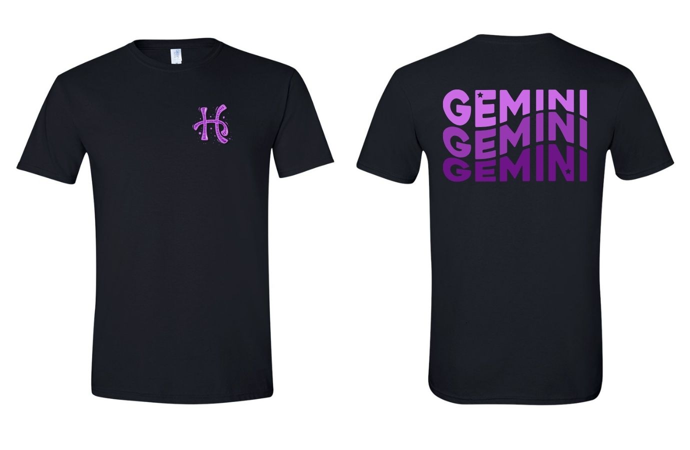 The front features a pocket-sized Gemini symbol in a smooth blend of three vibrant color variations—subtle, but full of meaning. Turn around, and the back makes a statement with “Gemini” in a flowing, wavy font, layered in three gradient shades that echo the sign’s ever-shifting duality.